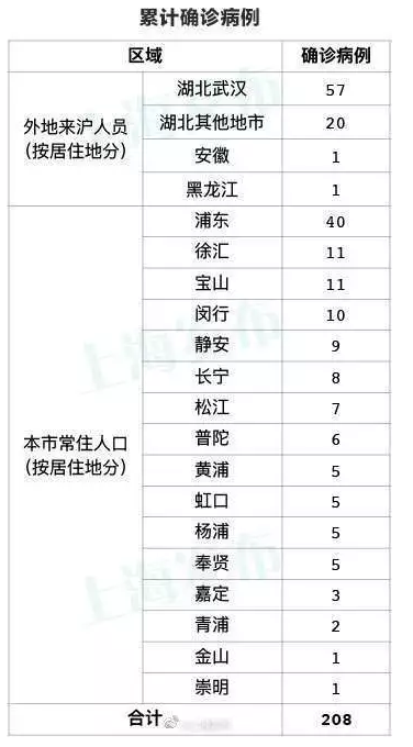 截至2月3日24時,上海市已累計排除疑似病例523例,發(fā)現(xiàn)確診病例208例。確診病例中,男性107例,女性101例;年齡最大88歲,最小7月齡;116例有湖北居住或旅行史,8例有湖北以外地區(qū)居住或旅行史,84例有相關病例接觸史;外地來滬人員79例,本市常住人口129例。具體情況如下: